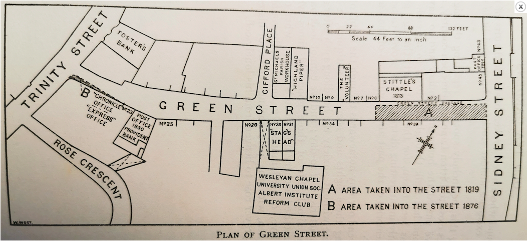 In 1815 his congregation took as his successor a Mr. Popplewell, for whom in 1818, as the lease of the old building had nearly expired, and the owner refused to renew it, there was hired at a rent of £40 by the few survivors of the congregation, a building on the south side of Green-street. This, after one or two intervening pastorates, was ministered to by a Mr. Snelgar (whose daughter subsequently became the wife of Mr. Shilleto, the great Greek scholar.) Under Mr. Snelgar troubles arose (apparently from his wishing to introduce more modern forms of worship, such as ceasing to read out the hymns line by line); and the congregation came to an end. Their new meeting place was subsequently hired by the Wesleyans; afterwards by the Union Society ; and, still later, by the Reform Club. It is now a billiard-room, in the yard adjoining No. 29.