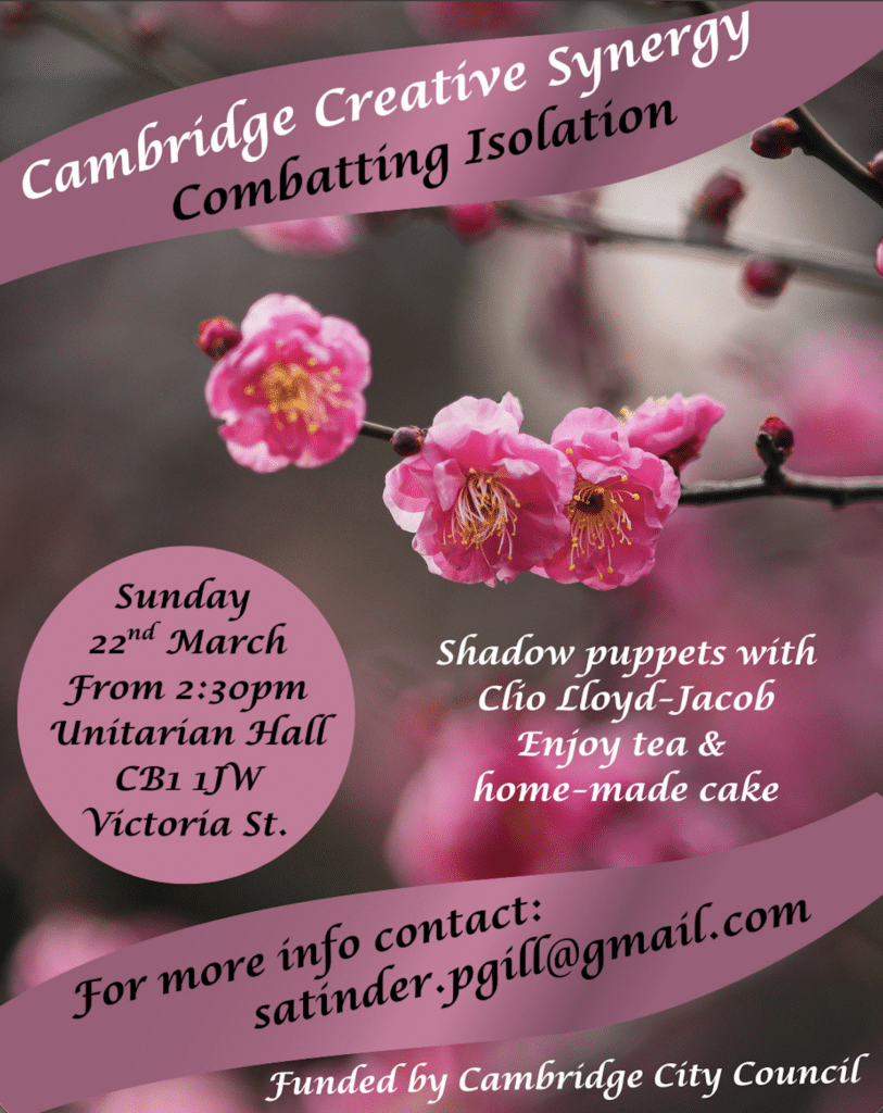 • A note about Cambridge Creative Synergy—Combatting Isolation, Sunday 22nd in the church hall from 2:30pm—Shadow puppets with Clio Lloyd-Jacob